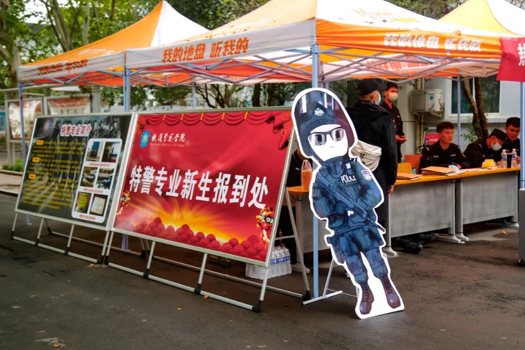 图像与网络侦查系则是迎新宣传最具科技感的系部。站在系部公寓楼前,最先映入眼帘的是AI机器人,同学们可以与机器人进行沟通交流,还可以欣赏别具特色的机器人表演。展示墙上写满了新生家长的祝福与期盼,新生一定可以以优异的成绩完成军训任务,蜕变成一名可靠有担当的预备警官。